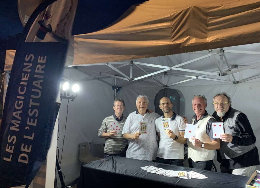 Nos magiciens en animation aux Flâneries de St Brévin le 18 juillet (de gauche à droite, Yves, Alain, Jocelyn, Joël et Patrick).